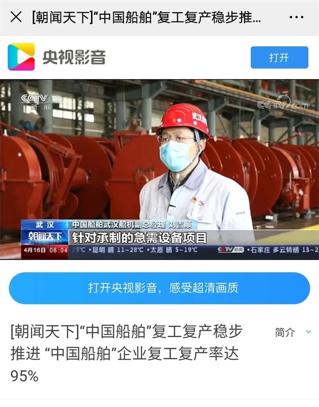 中國船舶武漢船機在疫情期間以及復工復產(chǎn)以來,全力以赴打好疫情防控阻擊戰(zhàn)和生產(chǎn)經(jīng)營攻堅戰(zhàn),產(chǎn)能達到90%以上,多臺設備先后密集交付,生產(chǎn)經(jīng)營呈現(xiàn)較好勢頭。國內(nèi)多家媒體紛紛聚焦武漢船機,激勵公司全體員工團結奮進、克難攻堅,以昂揚的斗志推動企業(yè)高質(zhì)量發(fā)展。